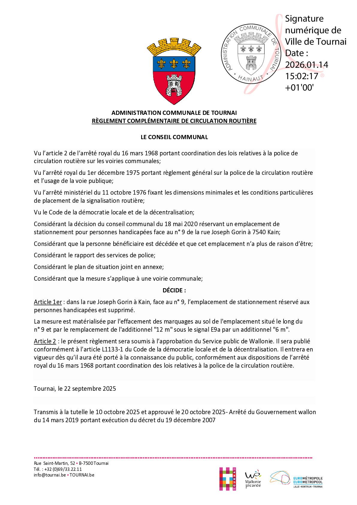 Avis de publication relatif à un règlement complémentaire de circulation routière : Kain rue Joseph Gorin 9 - Suppression EPH
