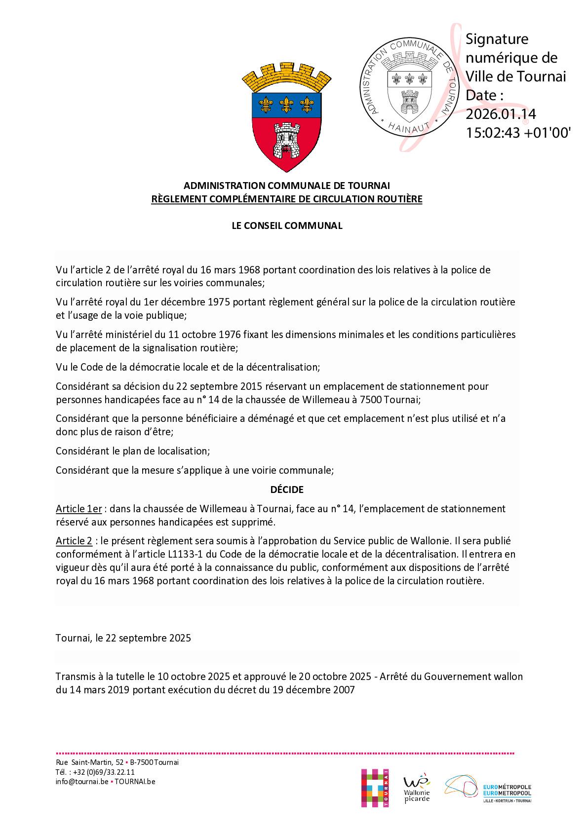 Avis de publication relatif à un règlement complémentaire de circulation routière : Tournai chaussée de Willemeau 14 - Suppression EPH