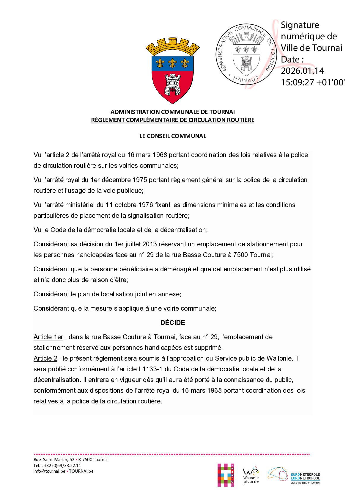 Avis de publication relatif à un règlement complémentaire de circulation routière : Tournai rue Basse Couture 29
