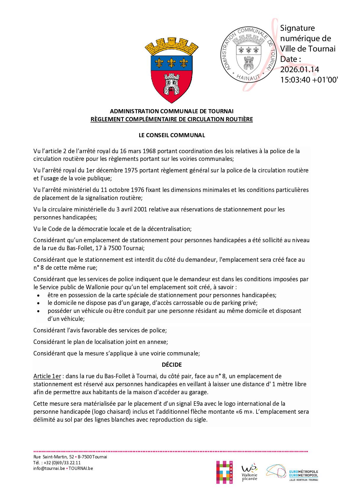 Avis de publication relatif à un règlement complémentaire de circulation routière : Tournai rue du Bas Follet 8