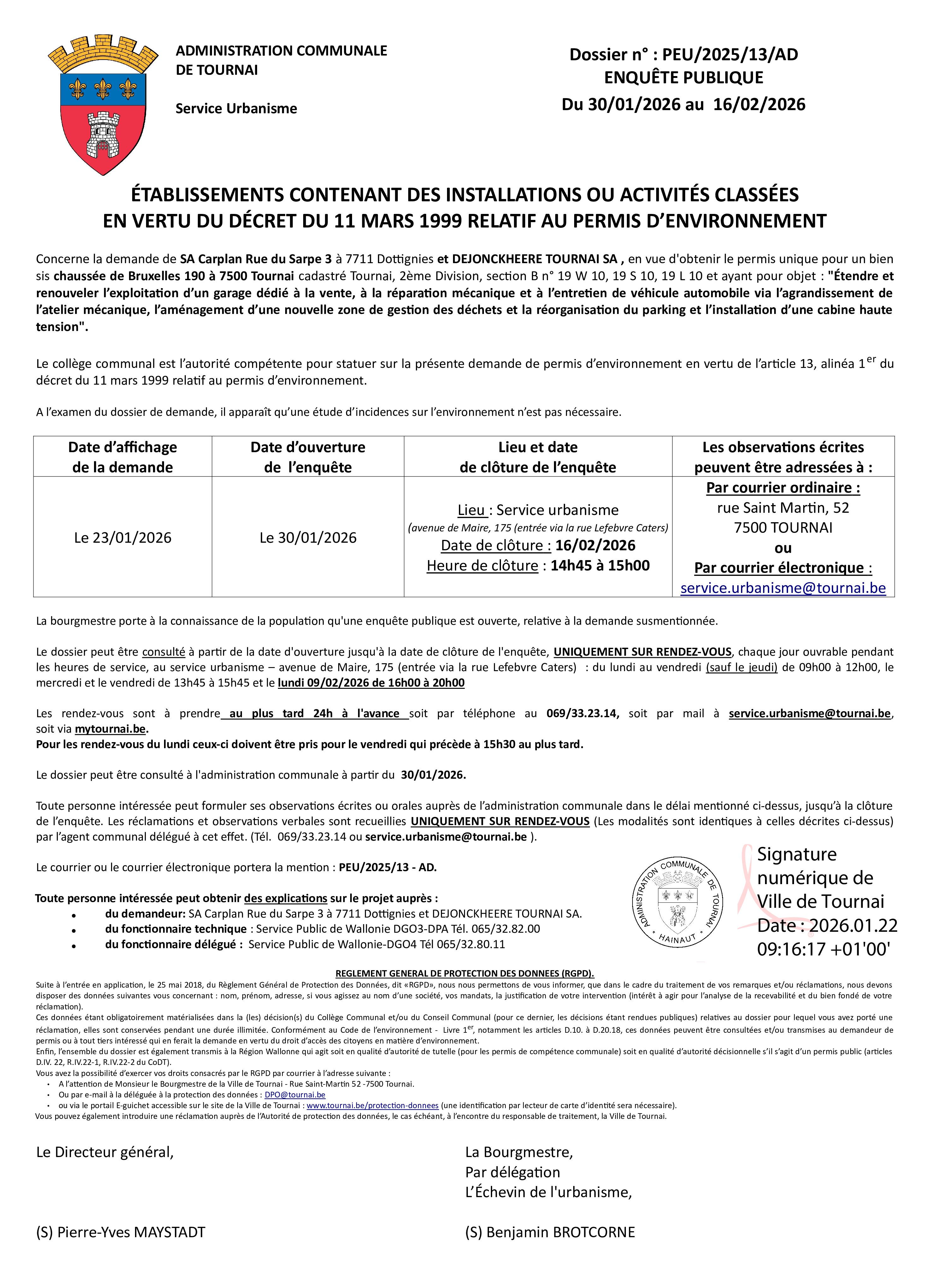 Concerne la demande de SA Carplan, rue du Sarpe 3 à 7711 Dottignies, et de DEJONCKHEERE TOURNAI SA, en vue d’obtenir le permis unique pour un bien sis chaussée de Bruxelles 190 à 7500 Tournai, cadastré Tournai, 2e division, section B, n° 19 W 10, 19 S 10, 19 L 10, et ayant pour objet : "Étendre et renouveler l’exploitation d’un garage dédié à la vente, à la réparation mécanique et à l’entretien de véhicules automobiles via l’agrandissement de l’atelier mécanique, l’aménagement d’une nouvelle zone de gestion des déchets, la réorganisation du parking et l’installation d’une cabine haute tension".