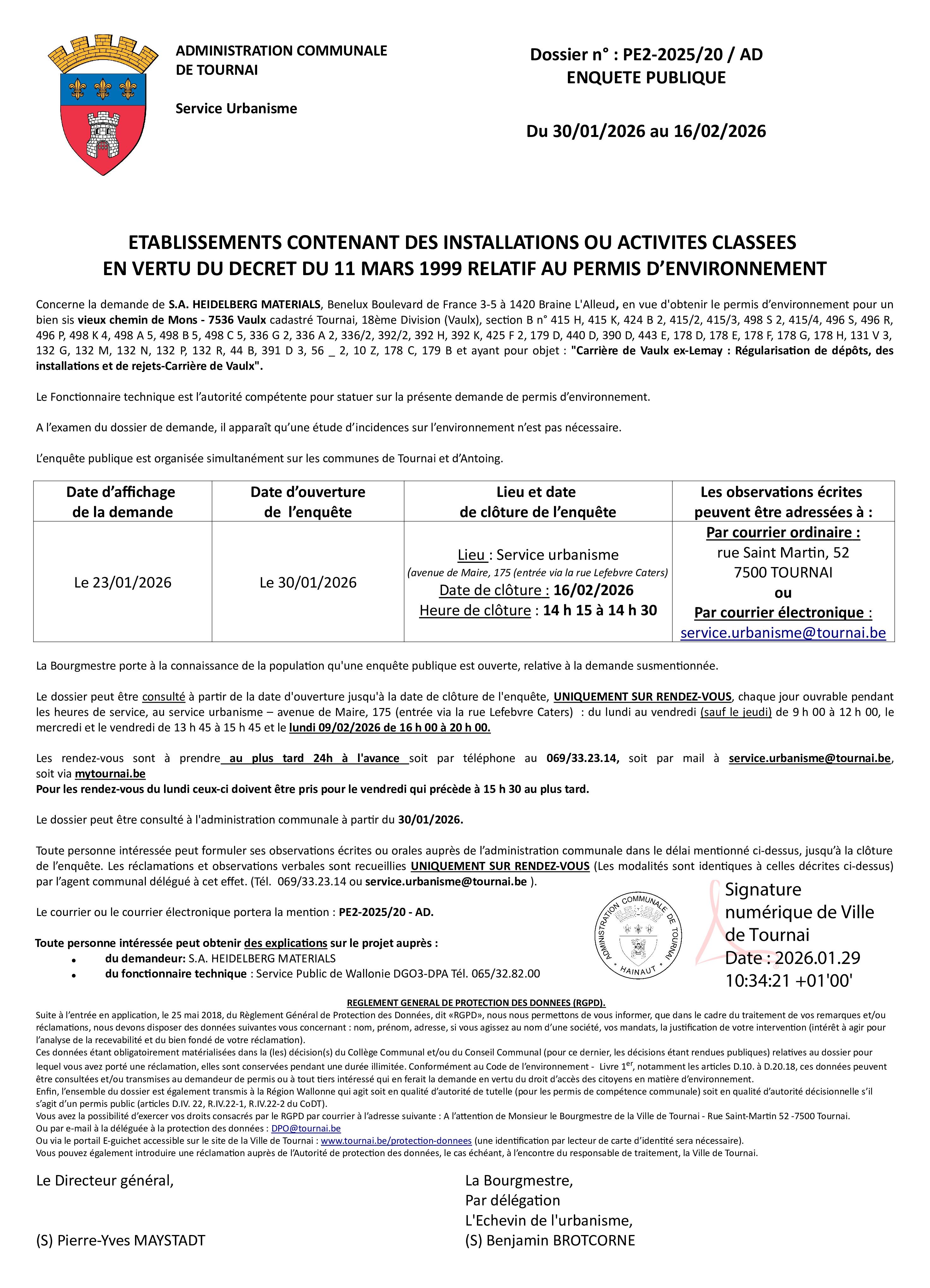 Concerne la demande de S.A. HEIDELBERG MATERIALS en vue d’obtenir le permis d’environnement pour un bien sis Vieux chemin de Mons, 7536 Vaulx, et ayant pour objet : « Carrière de Vaulx ex-Lemay : régularisation de dépôts, d’installations et de rejets – Carrière de Vaulx ».