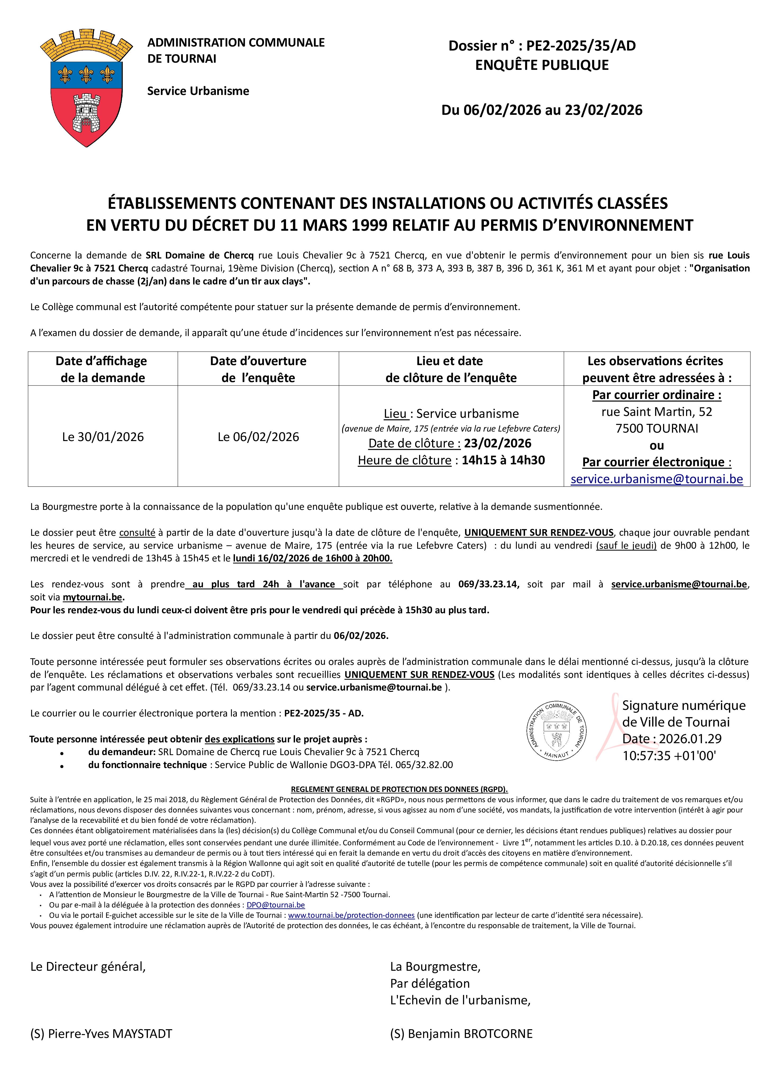 Concerne la demande de SRL Domaine de Chercq, rue Louis Chevalier 9c à 7521 Chercq, en vue d'obtenir le permis d’environnement pour un bien sis rue Louis Chevalier 9c à 7521 Chercq, cadastré Tournai, 19e division (Chercq), section A n° 68 B, 373 A, 393 B, 387 B, 396 D, 361 K, 361 M et ayant pour objet : « Organisation d'un parcours de chasse (2 j/an) dans le cadre d’un tir aux clays ».