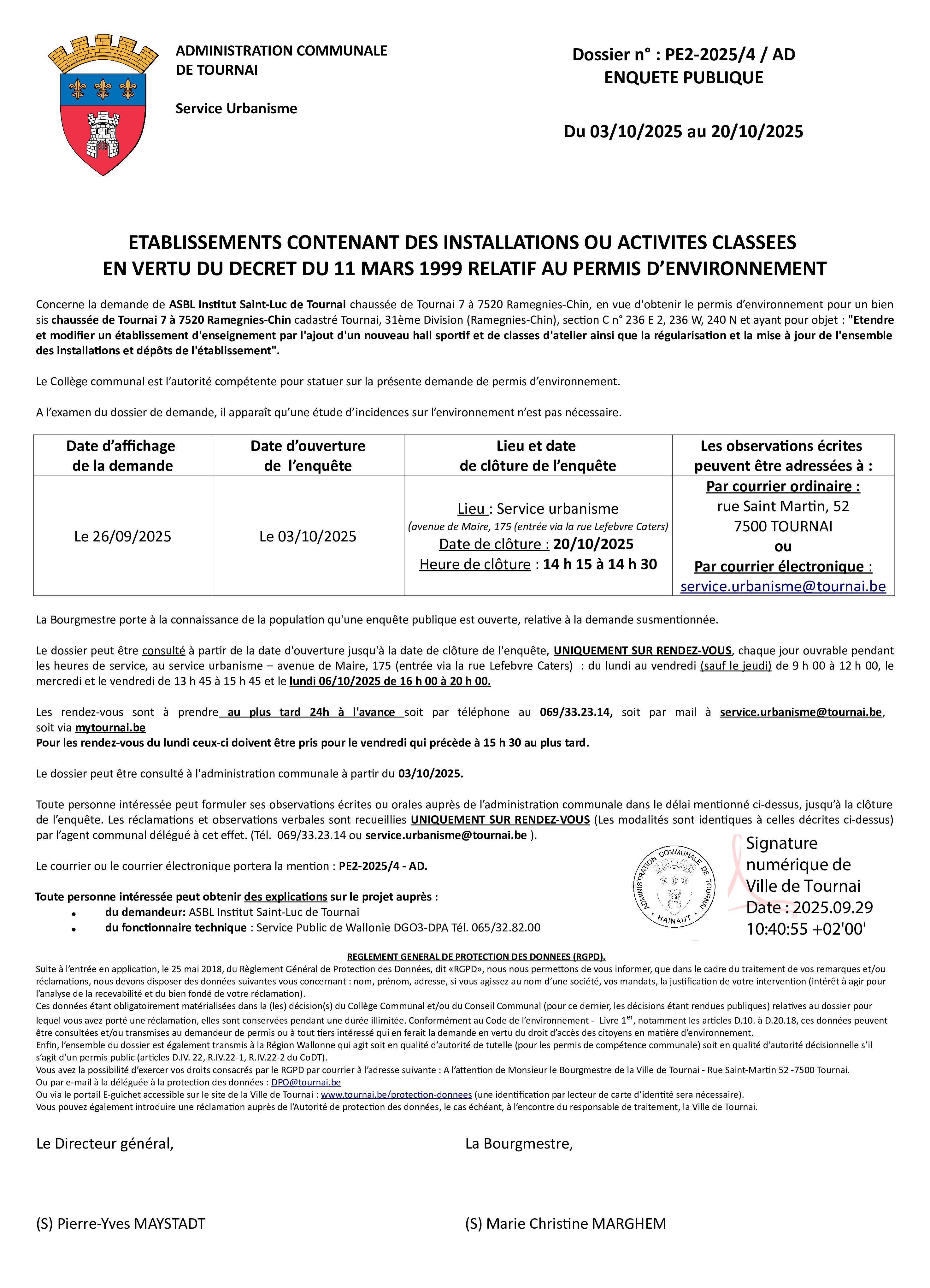Concerne la demande de l’ASBL Institut Saint-Luc de Tournai en vue d’obtenir le permis d’environnement pour un bien sis chaussée de Tournai 7 à 7520 Ramegnies-Chin, cadastré Tournai et ayant pour objet : "Étendre et modifier un établissement d’enseignement par l’ajout d’un nouveau hall sportif et de classes d’atelier, ainsi que la régularisation et la mise à jour de l’ensemble des installations et dépôts de l’établissement".