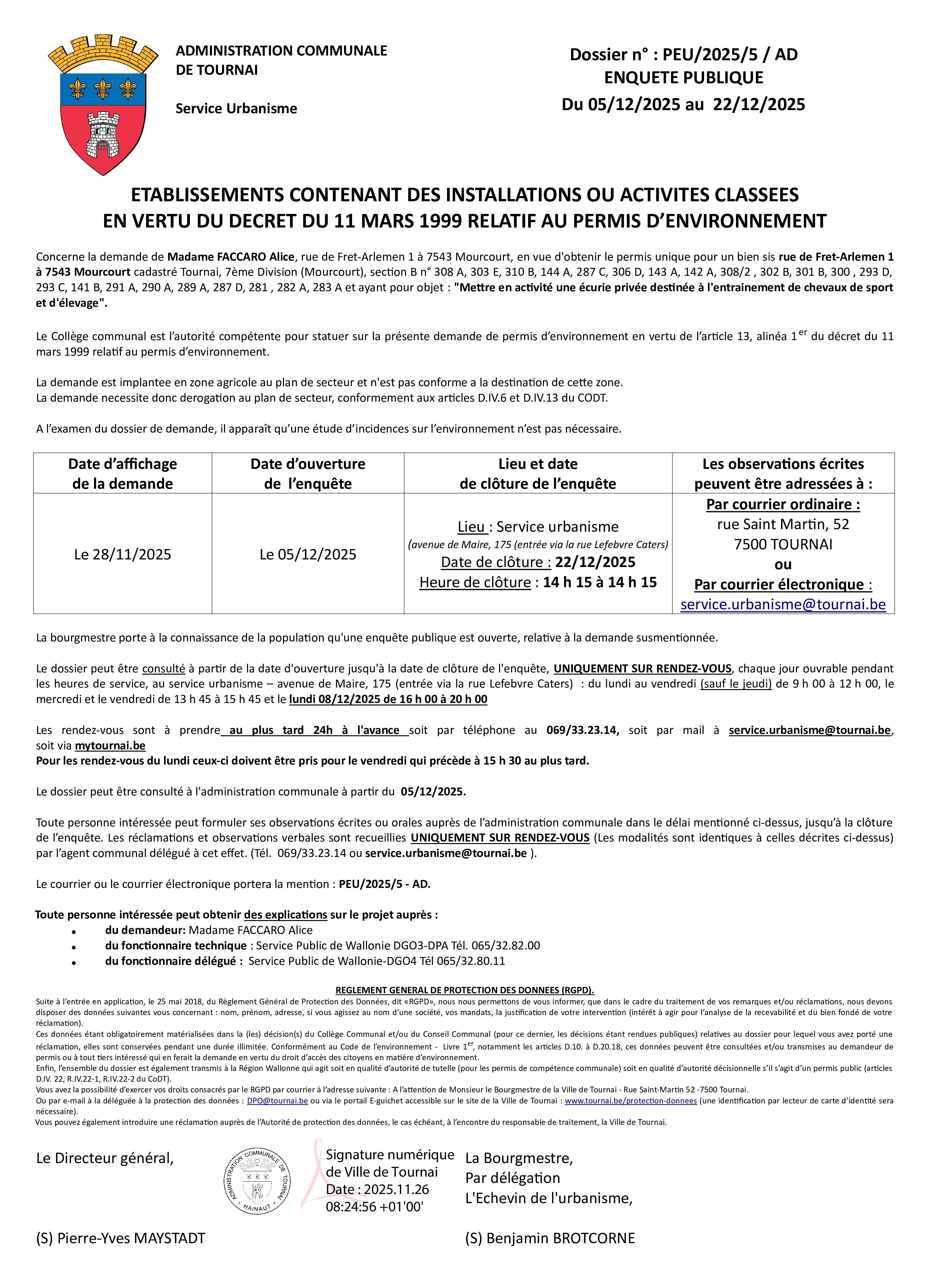 Concerne la demande de Madame FACCARO Alice en vue d'obtenir le permis unique pour un bien sis rue de Fret-Arlemen 1 à 7543 Mourcourt, ayant pour objet : « Mettre en activité une écurie privée destinée à l'entraînement de chevaux de sport et d'élevage.