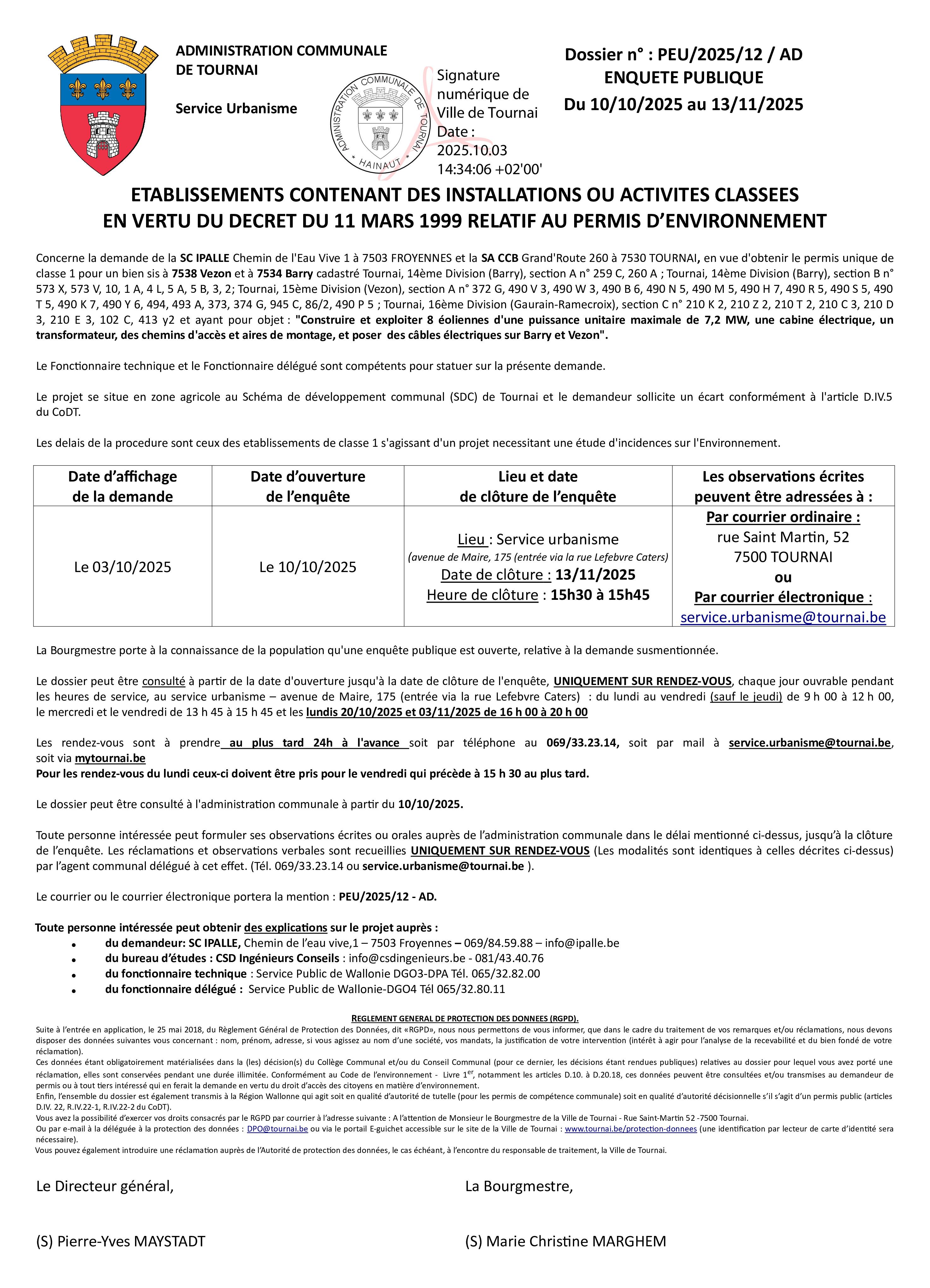 Concerne la demande de la SC IPALLE et la SA CCB en vue d'obtenir le permis unique de classe 1 ayant pour objet : "Construire et exploiter 8 éoliennes d'une puissance unitaire maximale de 7,2 MW, une cabine électrique, un transformateur, des chemins d'accès et aires de montage, et poser des câbles électriques sur Barry et Vezon".