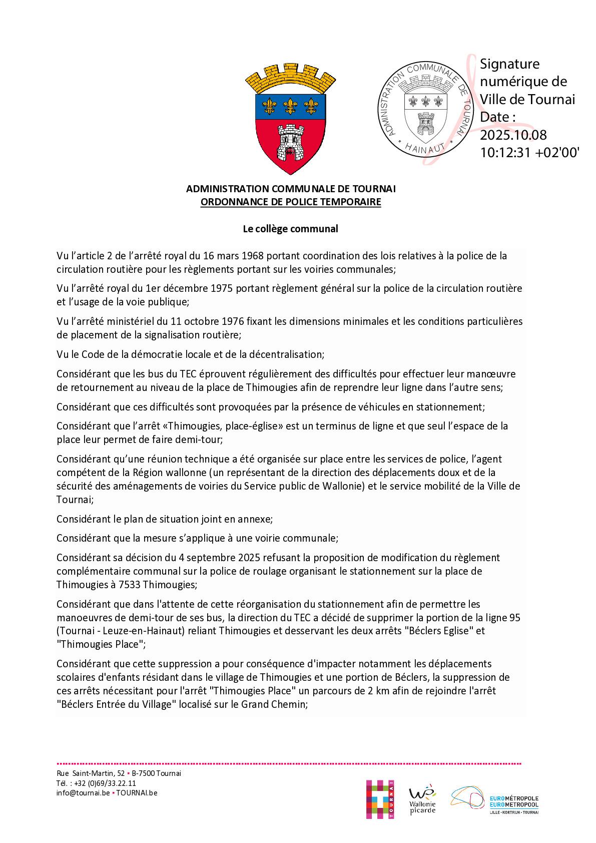 Effet recherché : rétablir rapidement la desserte des arrêts "Thimougies Place" et "Béclers Église" en attendant un règlement complémentaire définitif.