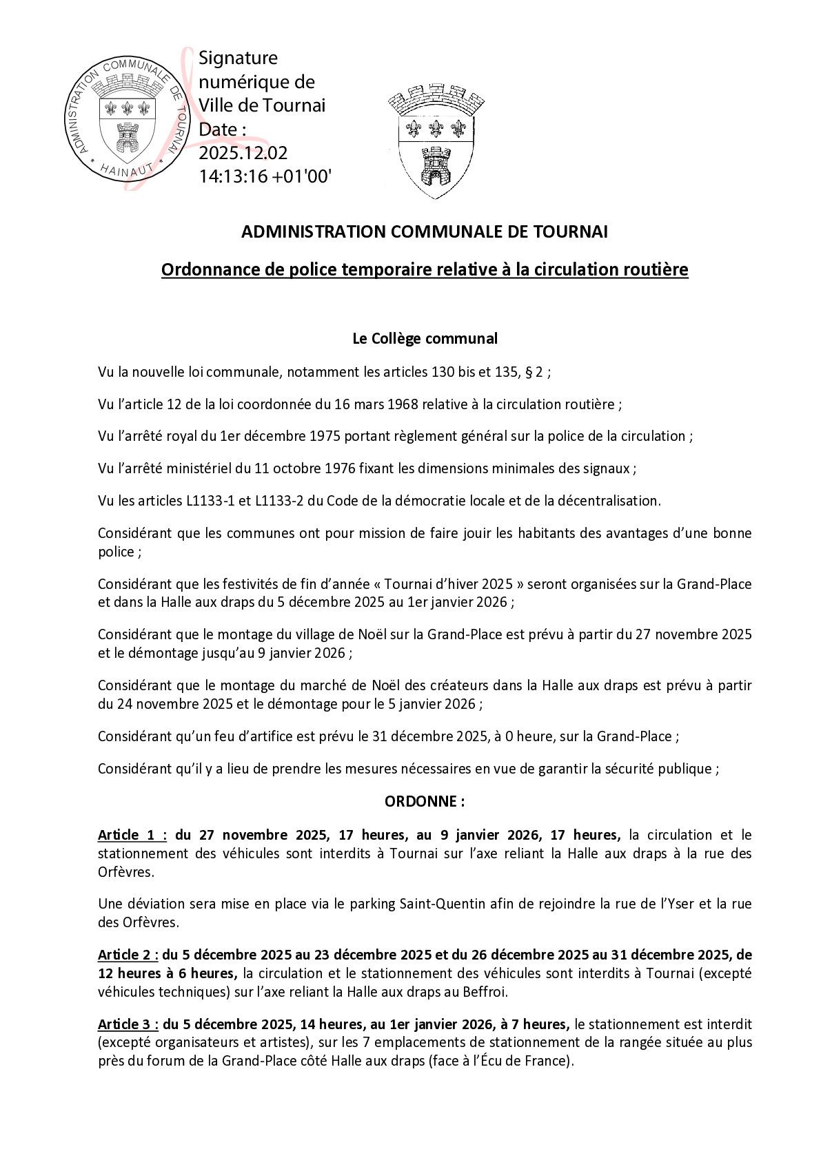 Ordonnance de police temporaire prise dans le cadre des festivités "Tournai d'Hiver"