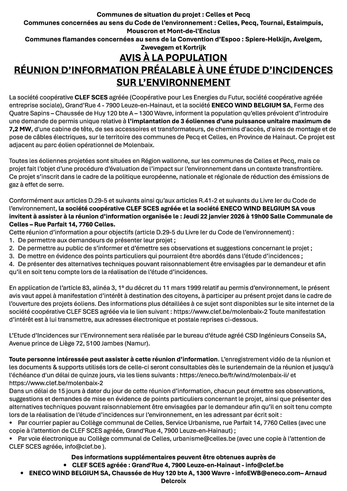 La société coopérative CLEF SCES agréée et la société ENECO WIND BELGIUM SA, informent la population qu’elles prévoient d’introduire une demande de permis unique relative à l’implantation de 3 éoliennes d’une puissance unitaire maximum de 7,2 MW sur le territoire des communes de Pecq et Celles, en Province de Hainaut.