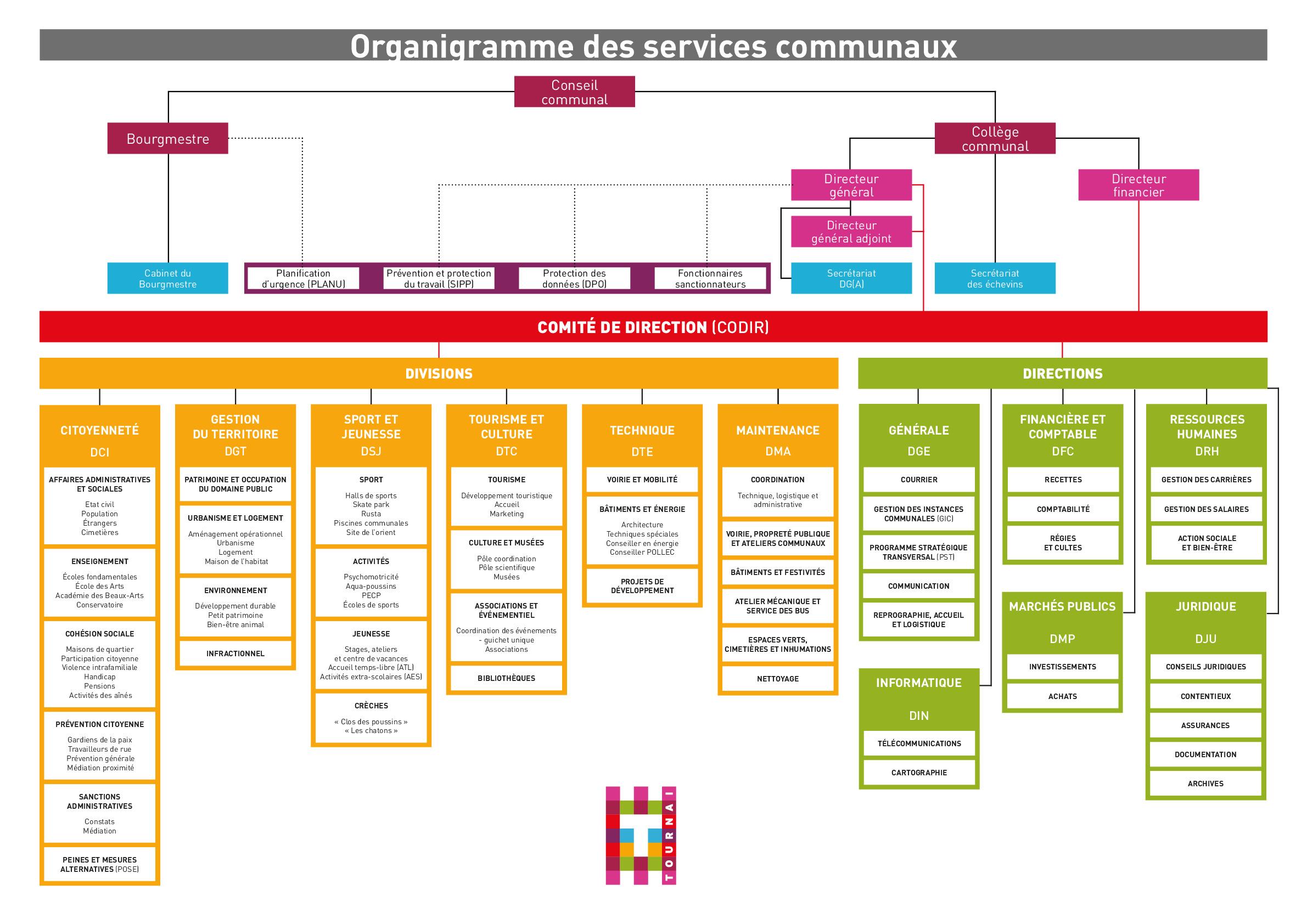 Notre administration comporte 6 directions au service de 6 divisions au service de la population. Les directions transversales illustrent la volonté de s’inscrire dans une démarche managériale marquée par la transversalité et le souhait de créer des synergies avec d’autres entités administratives comme le CPAS.