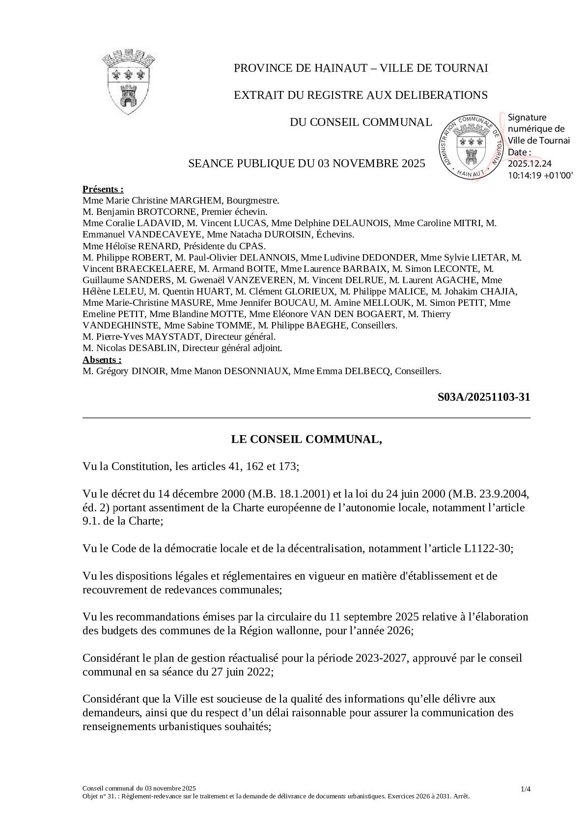 Le conseil communal du 3 novembre 2025 a arrêté les termes du règlement-redevance sur le traitement et la demande de délivrance de documents urbanistiques.