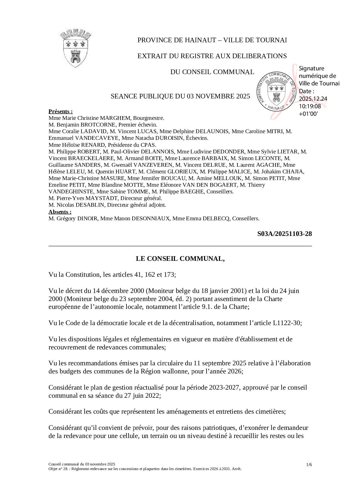 Le conseil communal du 3 novembre 2025 a arrêté les termes du règlement-redevance sur les concessions et plaquettes dans les cimetières.