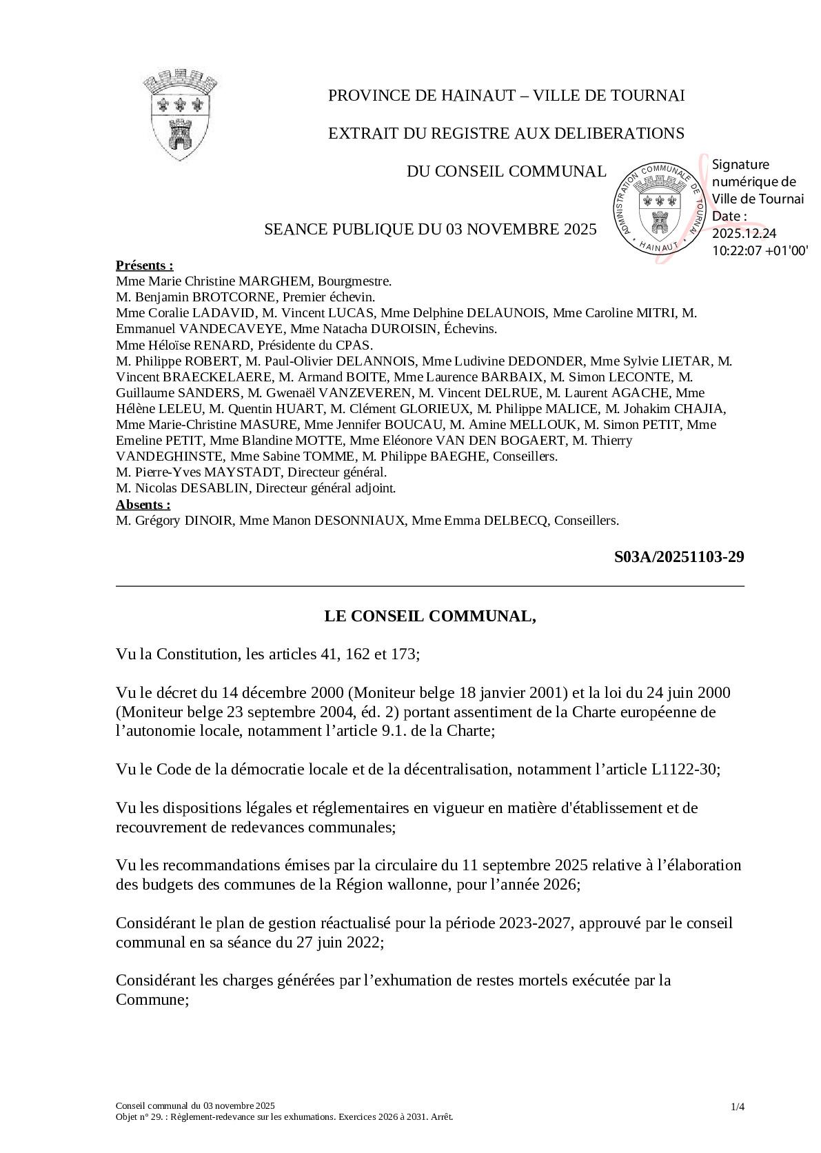 Le conseil communal du 3 novembre 2025 a arrêté les termes du règlement-redevance sur les exhumations.