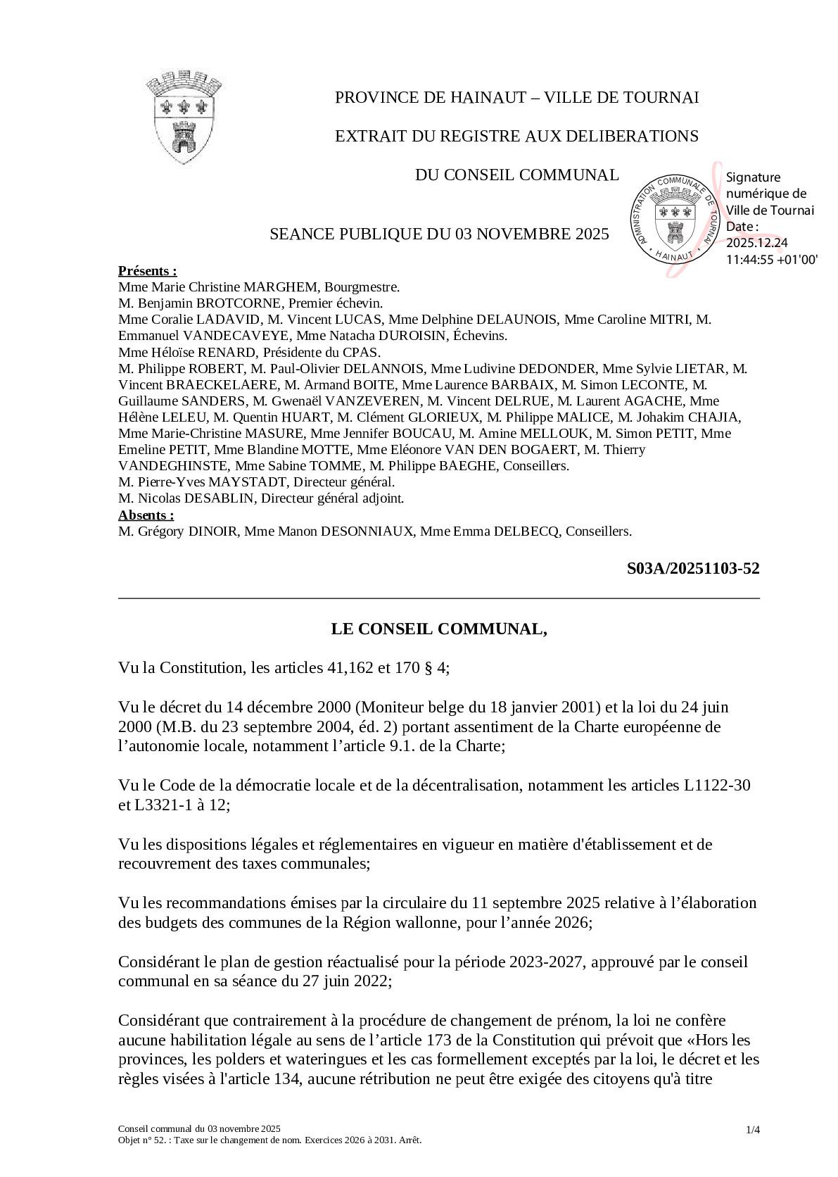 Le conseil communal du 3 novembre 2025 a arrêté les termes de la taxe sur le changement de nom.