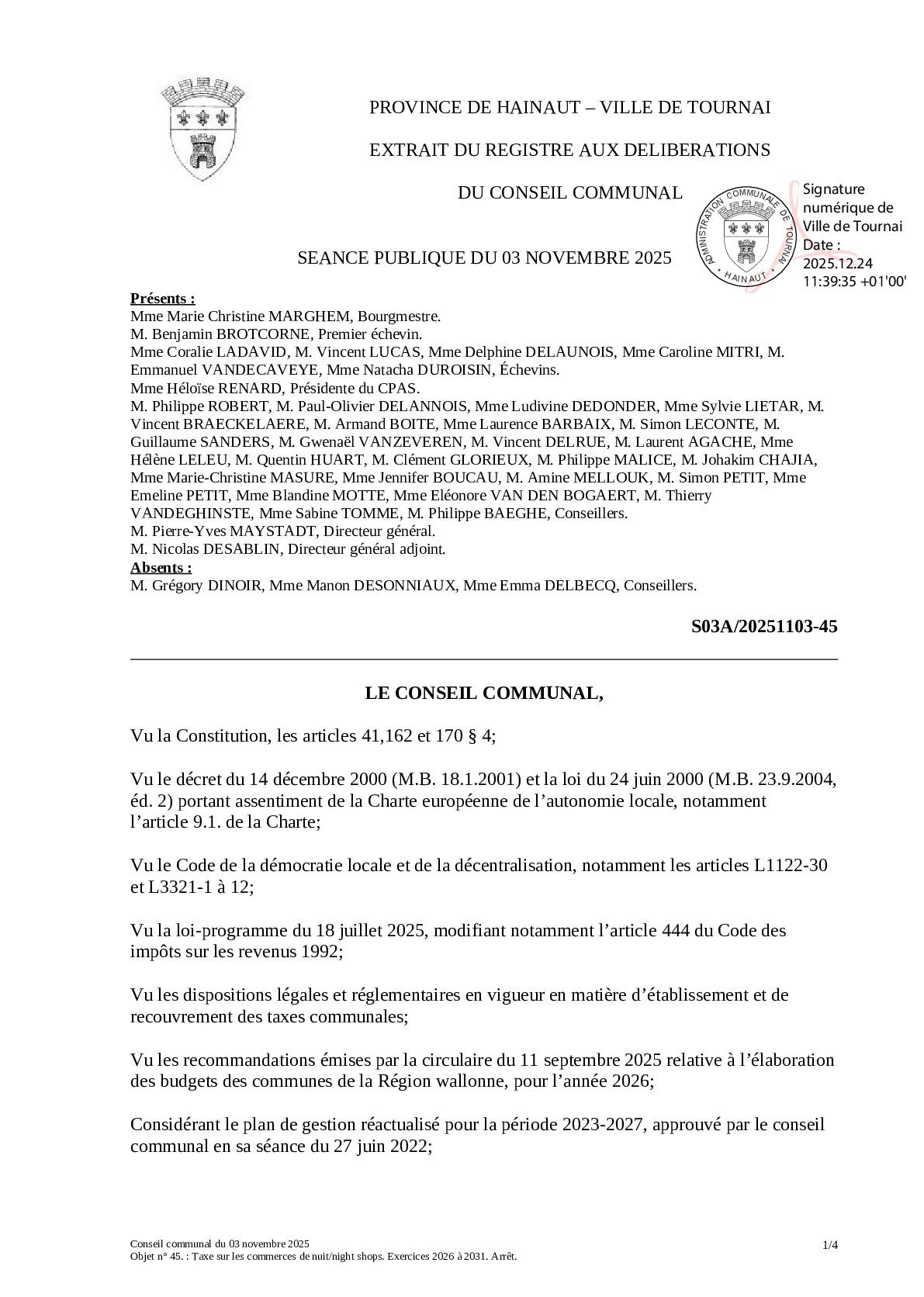 Le conseil communal du 3 novembre 2025 a arrêté les termes de la taxe sur les commerces de nuit (night shops).