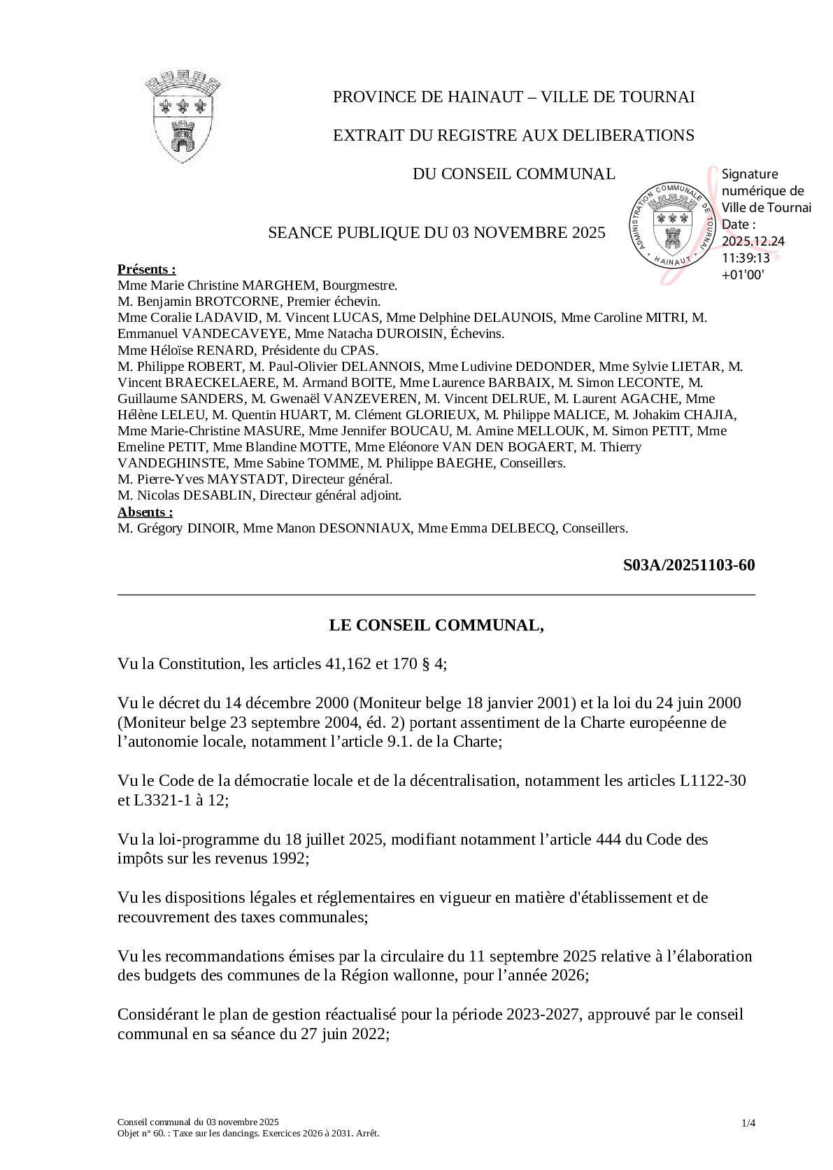 Le conseil communal du 3 novembre 2025 a arrêté les termes de la taxe sur les dancings.