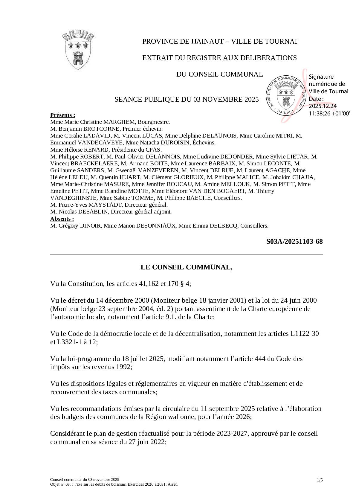 Le conseil communal du 3 novembre 2025 a arrêté les termes de la taxe sur les débits de boissons.