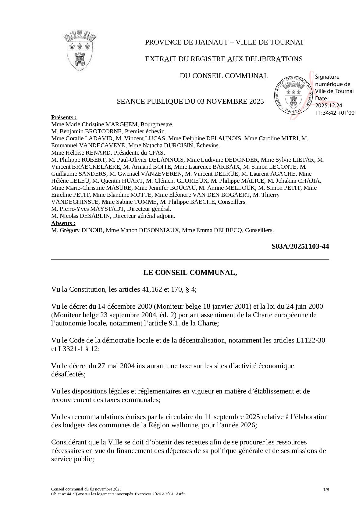 Le conseil communal du 3 novembre 2025 a arrêté les termes de la taxe sur les logements inoccupés.