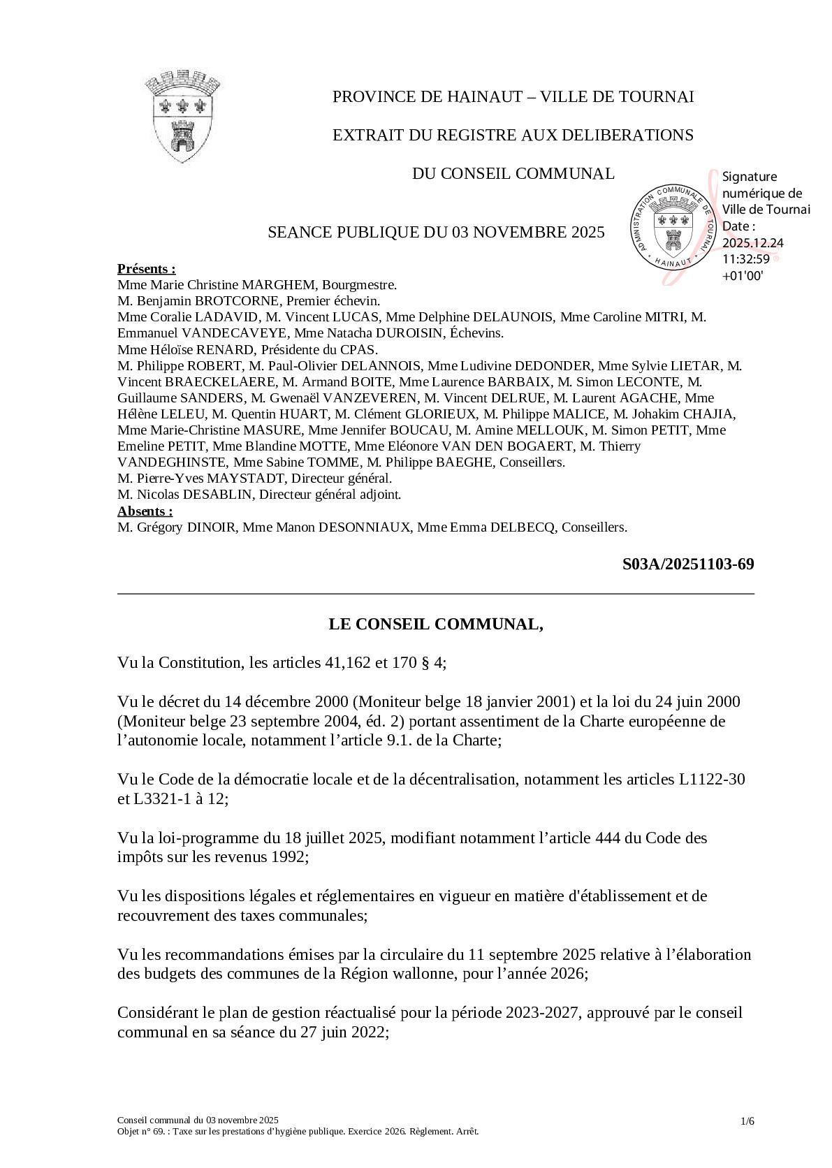 Le conseil communal du 3 novembre 2025 a arrêté les termes de la taxe sur les prestations d'hygiène publique.