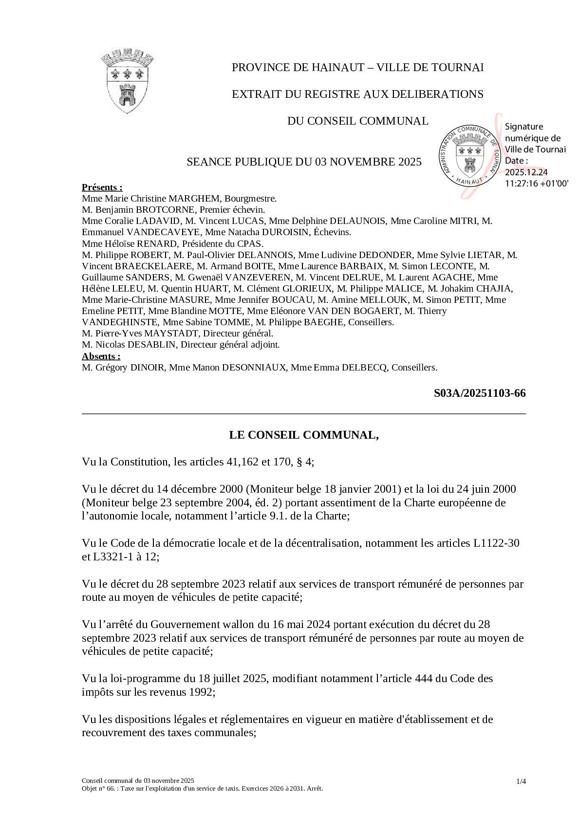 Le conseil communal du 3 novembre 2025 a arrêté les termes de la taxe sur l'exploitation d'un service de taxis.