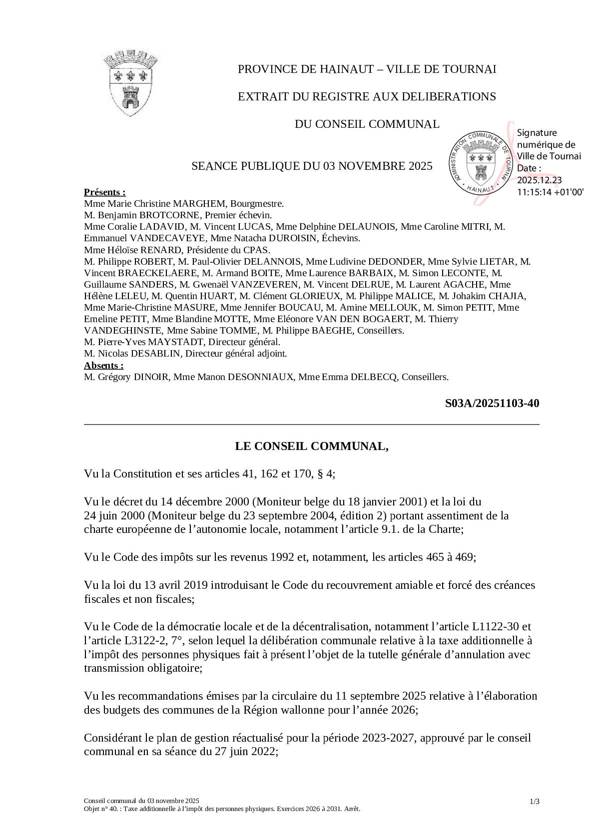 Le Conseil communal du 3 novembre 2025 a arrêté les centimes additionnels à l’impôt des personnes physiques et au précompte immobilier, pour les exercices 2026 à 2031.