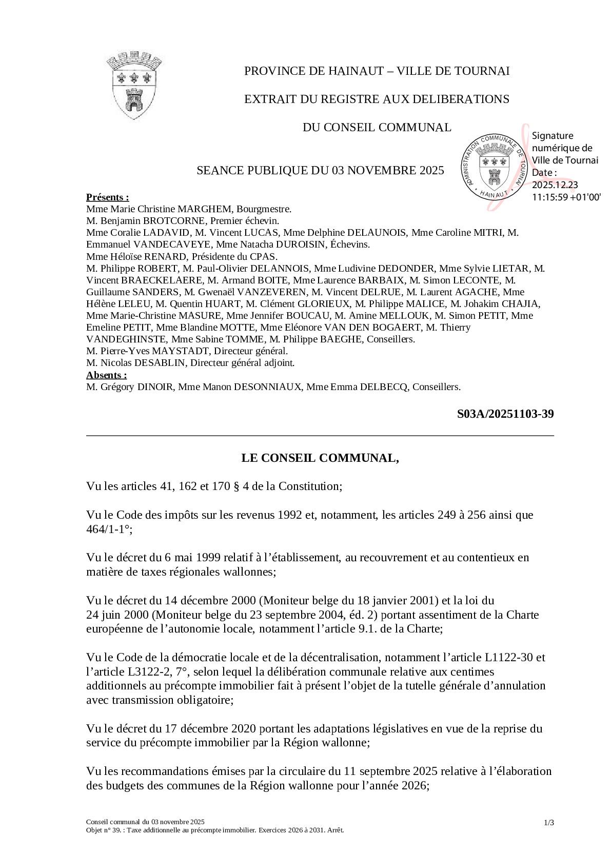 Il est établi, pour les exercices 2026 à 2031 inclus, au profit de la Ville de Tournai, 2.950 centimes additionnels au précompte immobilier.