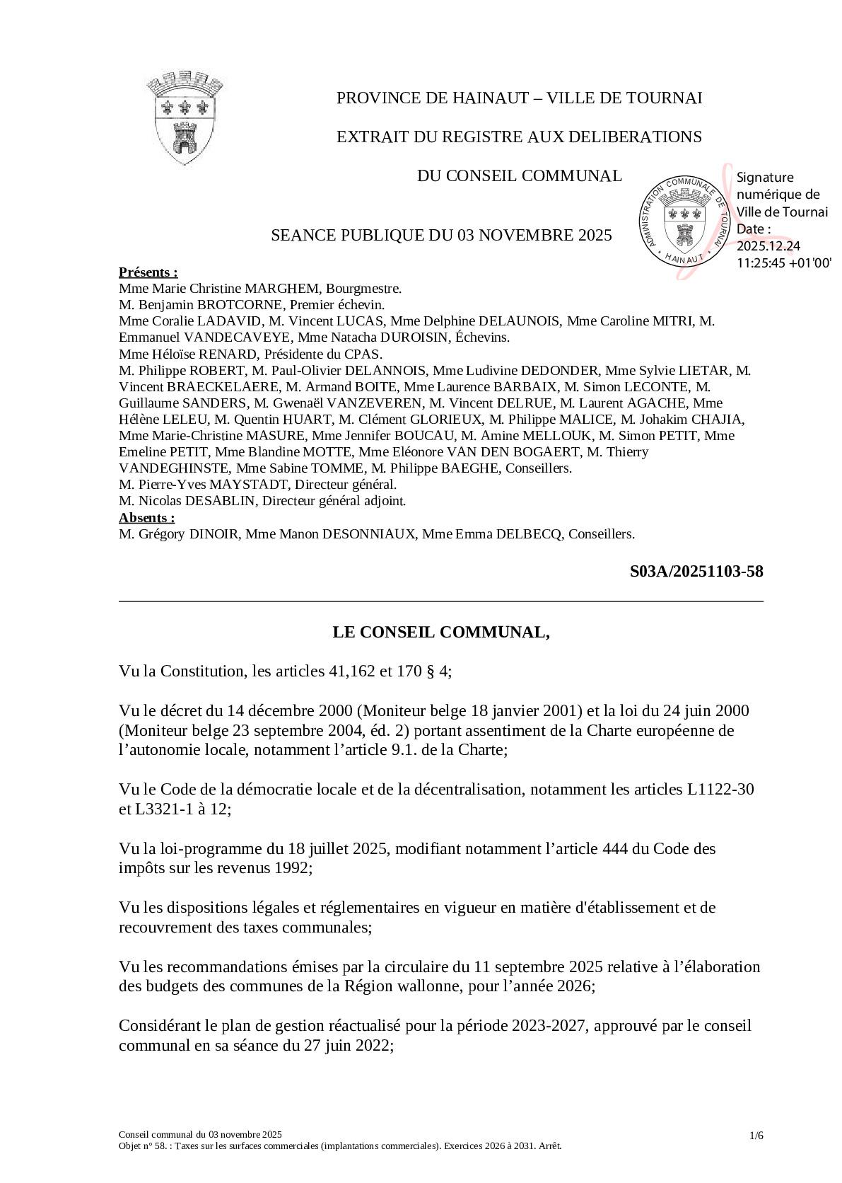 Le conseil communal du 3 novembre 2025 a arrêté les termes de la taxe sur les sur les surfaces commerciales - implantations commerciales.